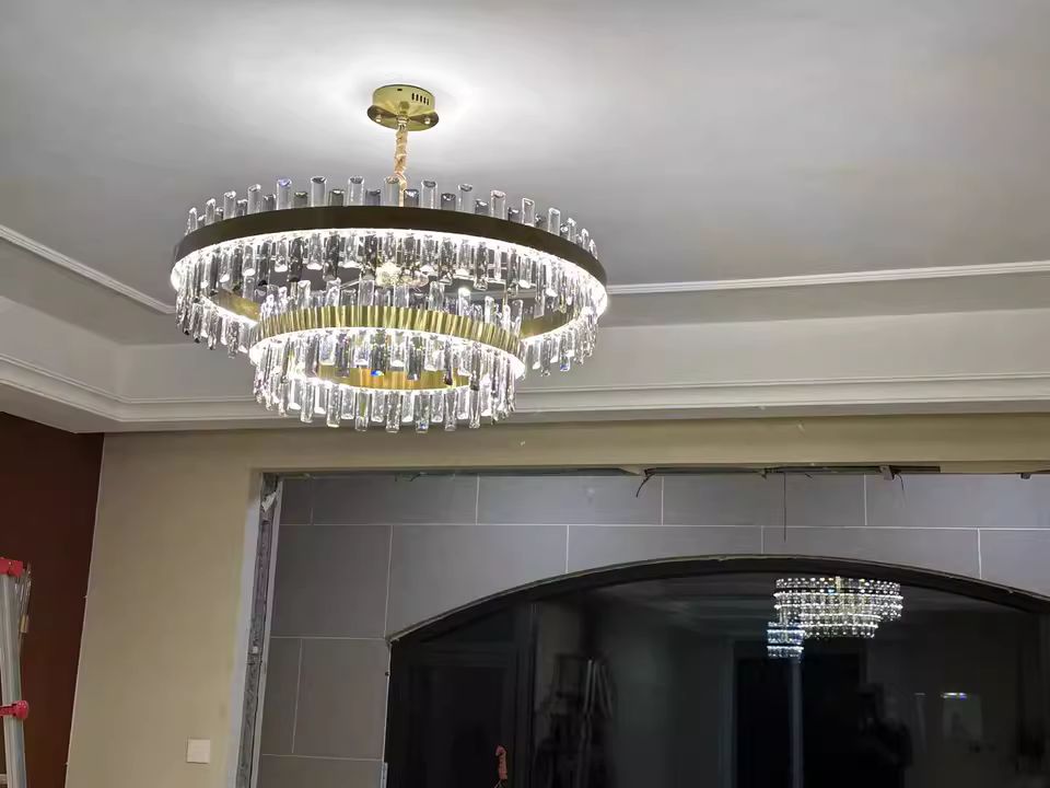 The Aurum Elegance Gold Metal Dual Tier Crystal Round Chandelier features a luxurious drum design with dimmable lighting for customizable ambiance. Made from high-quality metal and adorned with exquisite crystals, it enhances your interior's aesthetic. Its adjustable height suits various ceiling heights and room styles.