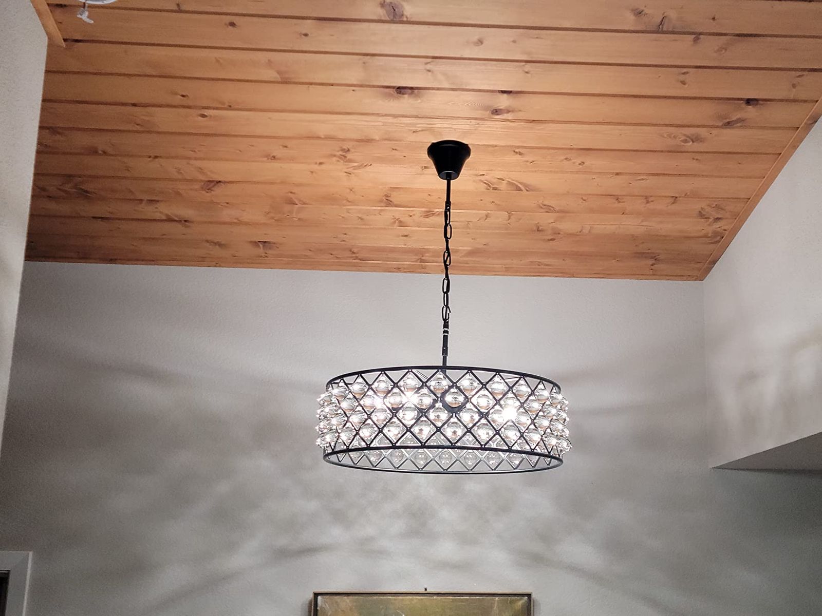 Add a classy yet brilliant touch to your living space with the bold and dramatic composition of this Black Drum Shaped Crystal Pendant Light. This contemporary fixture uses a drum-shaped silhouette punctuated with rows of crystal clear glass orbs that wonderfully reflect and refract illumination from the interior light source. A single, sturdy chain suspends the lamping from its base for a clean yet statement worthy display. Hang this piece over a cozy dining table or kitchen nook. Will also look fantastic as a lighting centerpiece in the bedroom, foyer or patio.