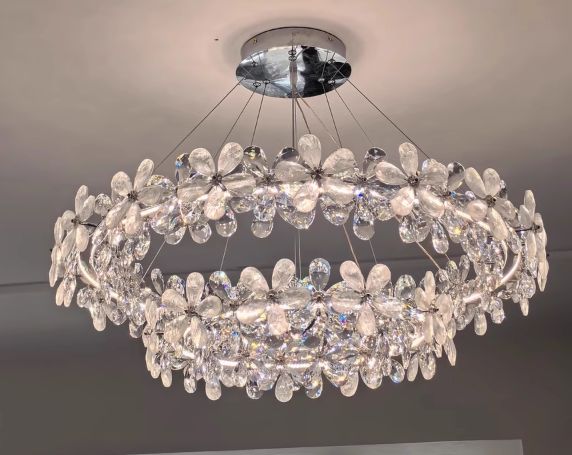 Add a touch of luxury with this Crystal Flower Dual-Halo Chandelier—featuring chrome finish, blooming crystal rings, and modern elegance. Perfect for any room, it offers adjustable brightness via wall switch, plus a durable, height-adjustable design to fit your space beautifully | Sofary.