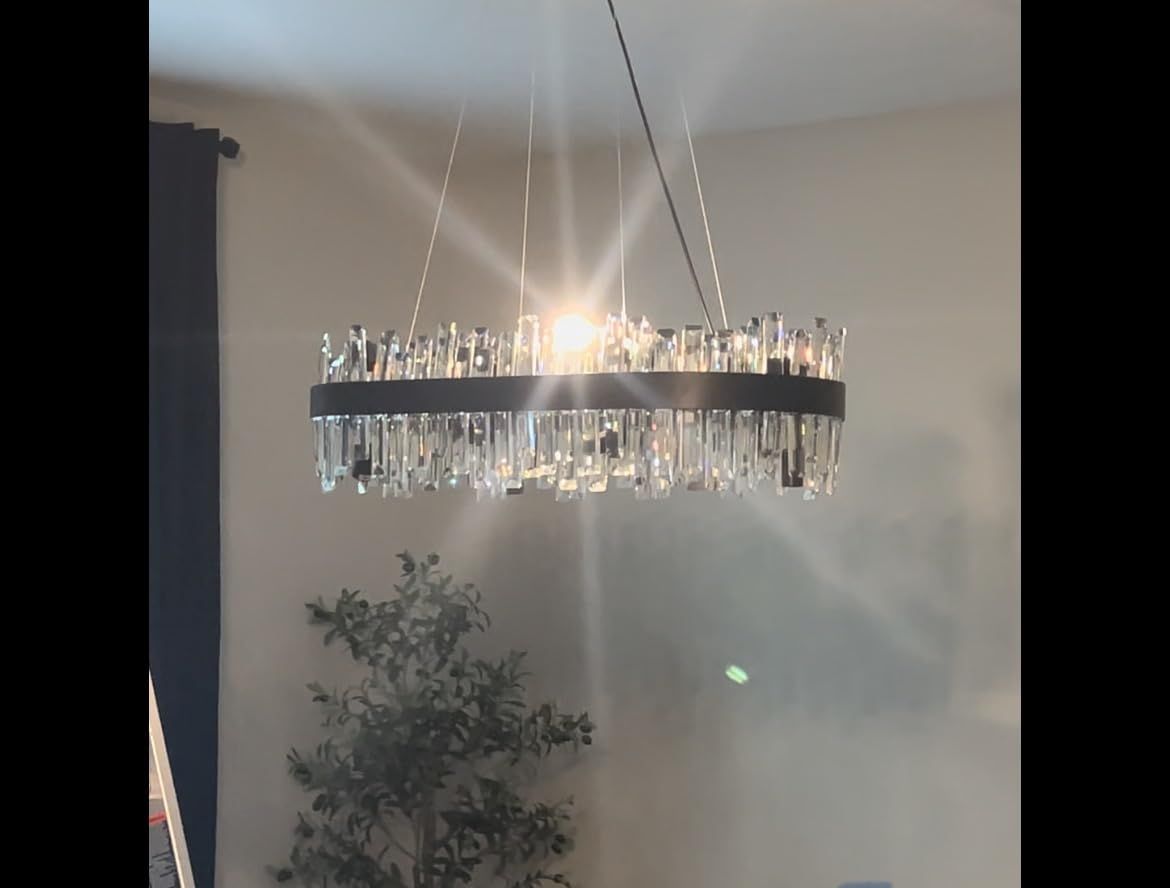 The Luxora Modern Black Metal Crystal Rectangular Chandelier is a sleek, polished black fixture with exquisite K9 crystal raindrops. Its elegant oval design creates a captivating light play, perfect for enhancing the ambiance of dining rooms, living areas, or kitchen islands. A stunning addition to any modern space.