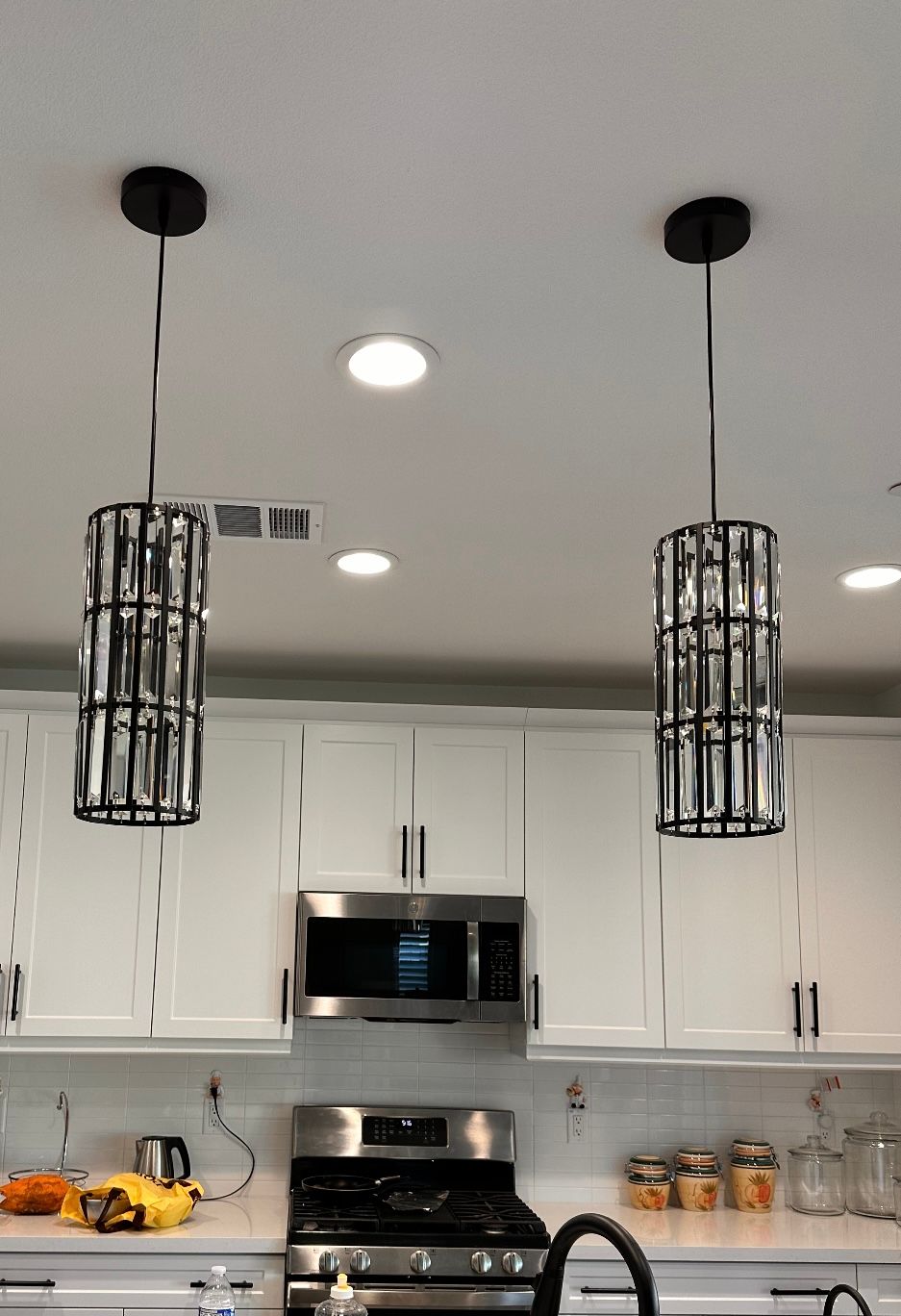 Strike the perfect balance between traditional and modern lighting elements with this Modern Creative Crystal Pendant Light. It features an eclectic blend of industrial and mid-century design, starting off with an array of clear, multi-faceted K9 crystals set within a neatly finished black metal frame. When lit, this piece playfully reflects and refracts light through the eye-catching, rectangular embellishments. A simple, no non-sense pendant light that is sure to take center stage as it hangs, preferably in multiples, over your living room, dining table, or kitchen island. Also looks excellent as a solo piece to dress up small corners.