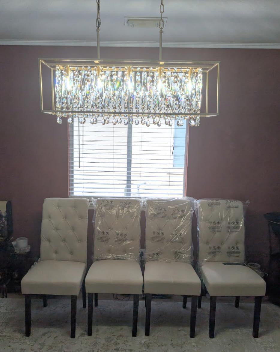 The Velora Luxury Gold Metal Crystal Rectangular Chandelier elevates any dining space with its gold metal frame and elegant crystal accents. Its stunning rectangular design enhances ambiance, while the interplay of light creates a luxurious atmosphere. Perfect for kitchen islands or dining rooms, it blends functionality with modern style.