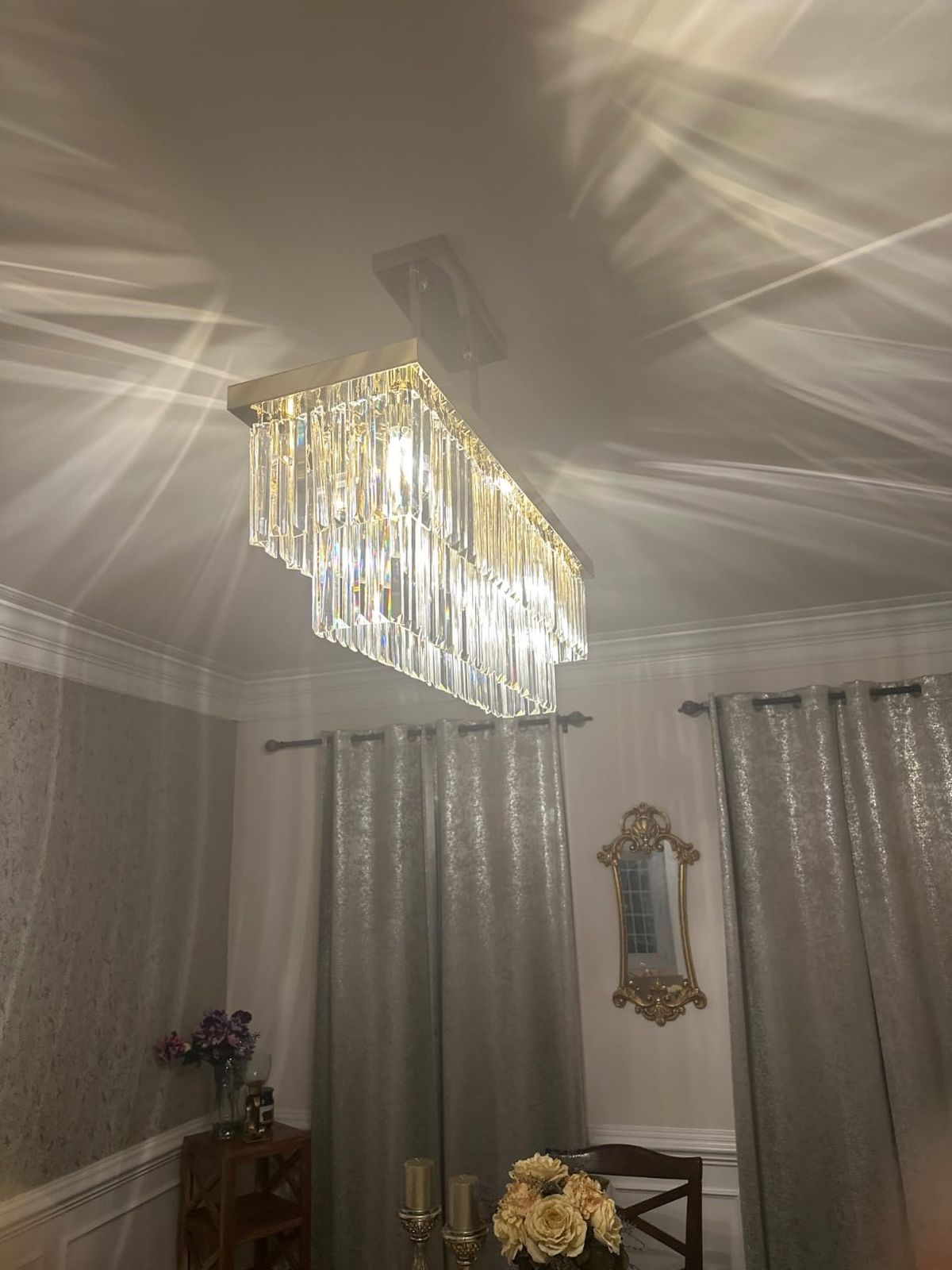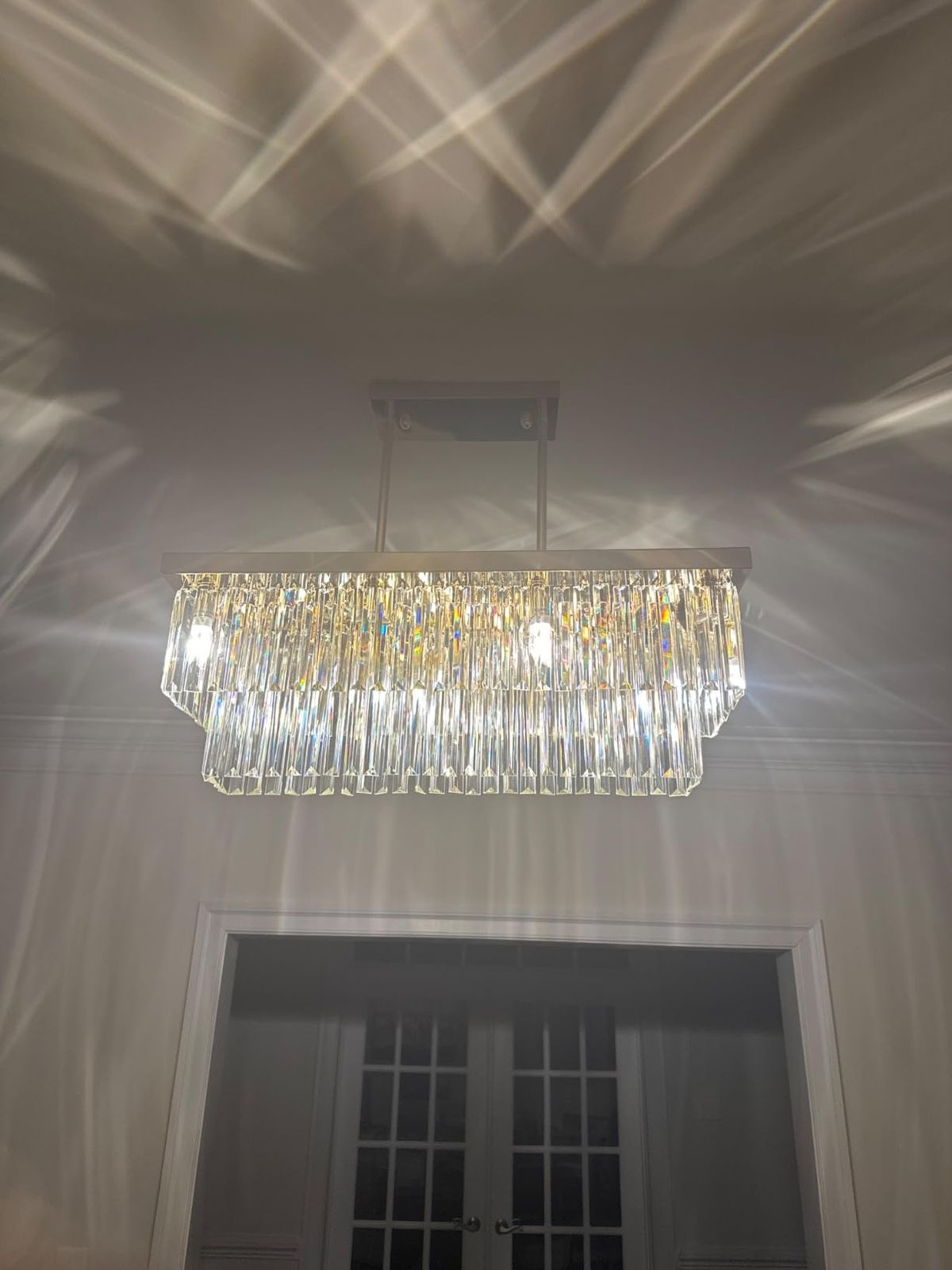 The Vespera Luxury Gold Metal Crystal Linear Chandelier elevates any dining space with its gold metal frame and elegant crystal accents. Its stunning rectangular design enhances ambiance, while the interplay of light creates a luxurious atmosphere. Perfect for kitchen islands or dining rooms, it blends functionality with modern style.